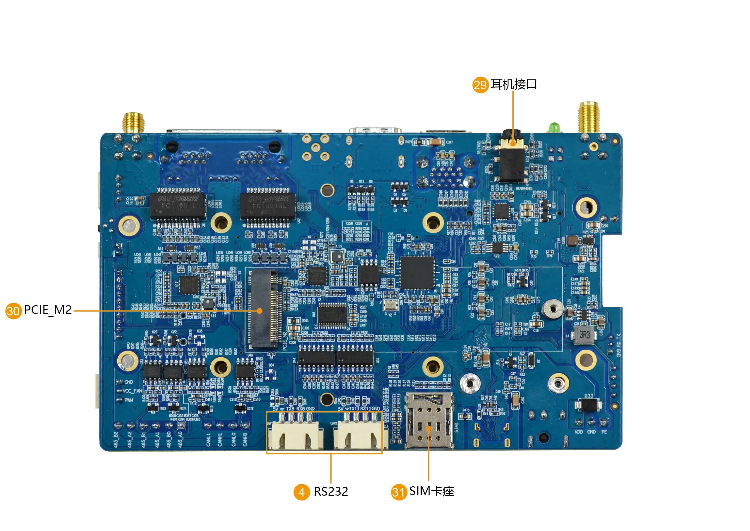 4G | 标准miniPCIe/ USB OTG接口4G模块(CAT1)。 1个标准nano SIM卡插槽,支持外插式安装。 支持如:N720等模块 | |