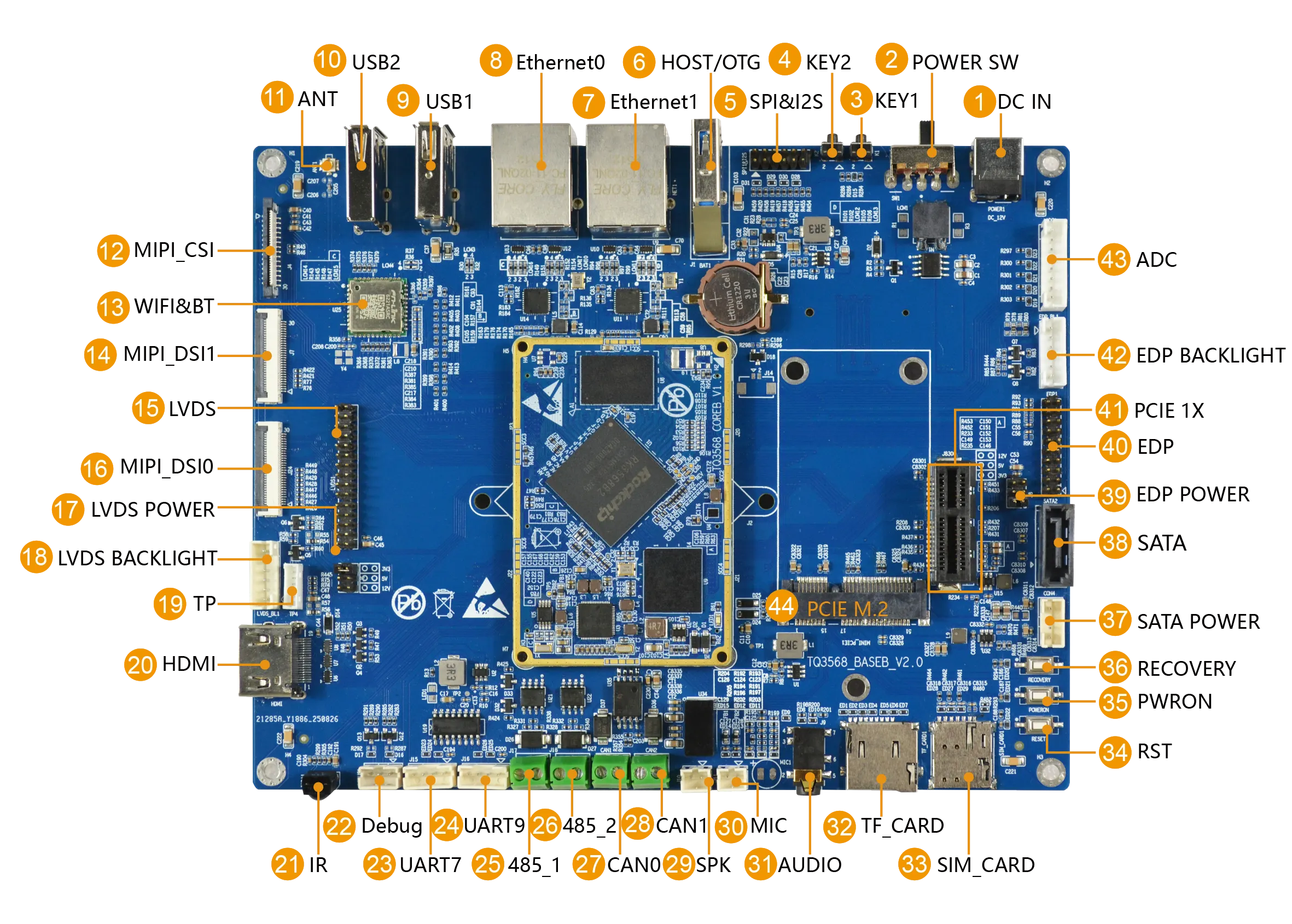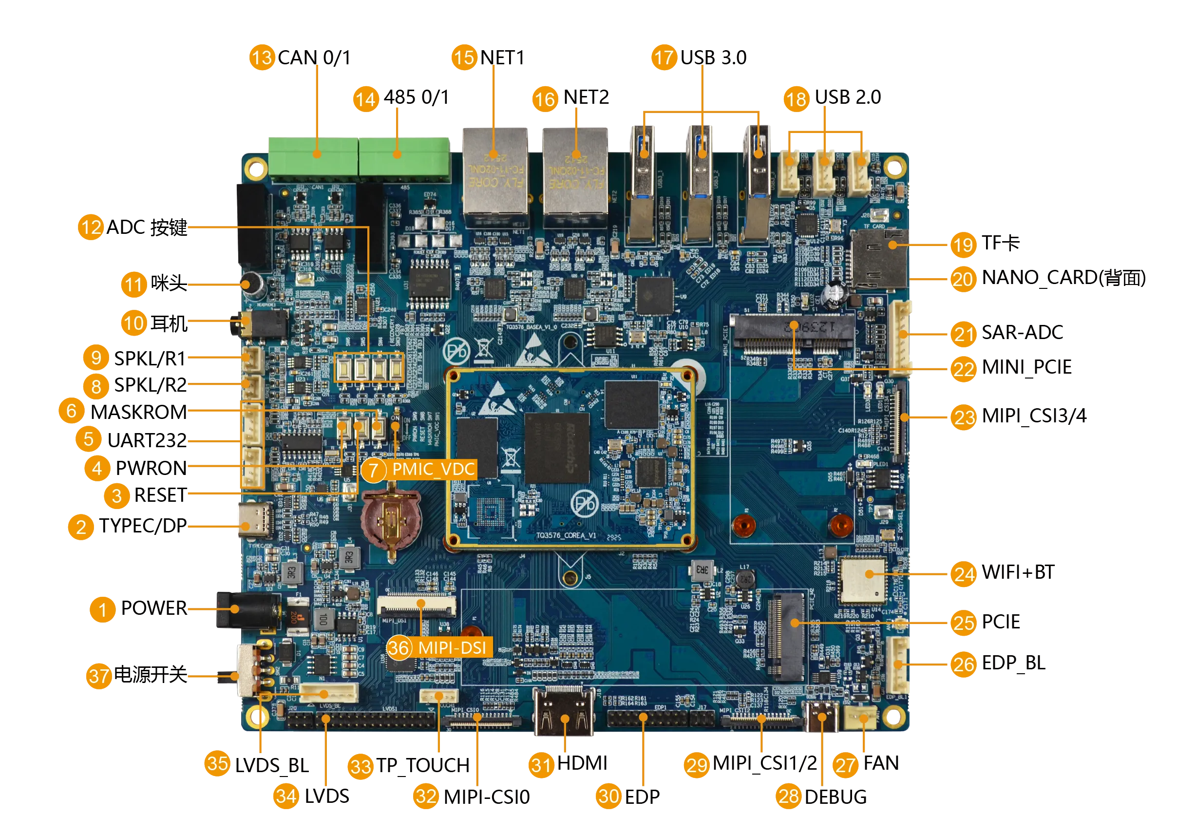 核心板引出了RK3568系列芯片的绝大部分功能,包含USB2.0、USB3.0、HDMI、eDP、MIPI_CSI、MIPI_DSI、 Ethernet GAMC、PCIe2.1、PCIe3.0、UART、CAN、SATA3.0、SPI、I2S、I2C等接口。可通过底板进行功能拓展,2路网口(千兆)、2路CAN、2路485、2路USB2.0、2路USB3.0、1路TF卡、2路串口等丰富功能。
